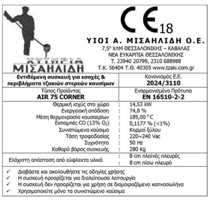 – Τζάκι διπλού τοιχώματος αποτελούμενο από χάλυβα 4mm.