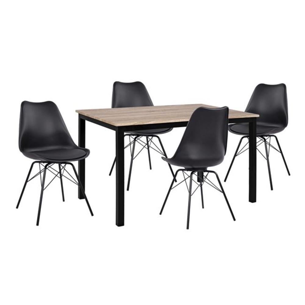 Τέσσερις καρέκλες με μεταλλικά πόδια, κάθισμα πολυπροπυλενίου και μαξιλαράκι από τεχνόδερμα σε μαύρη απόχρωση.