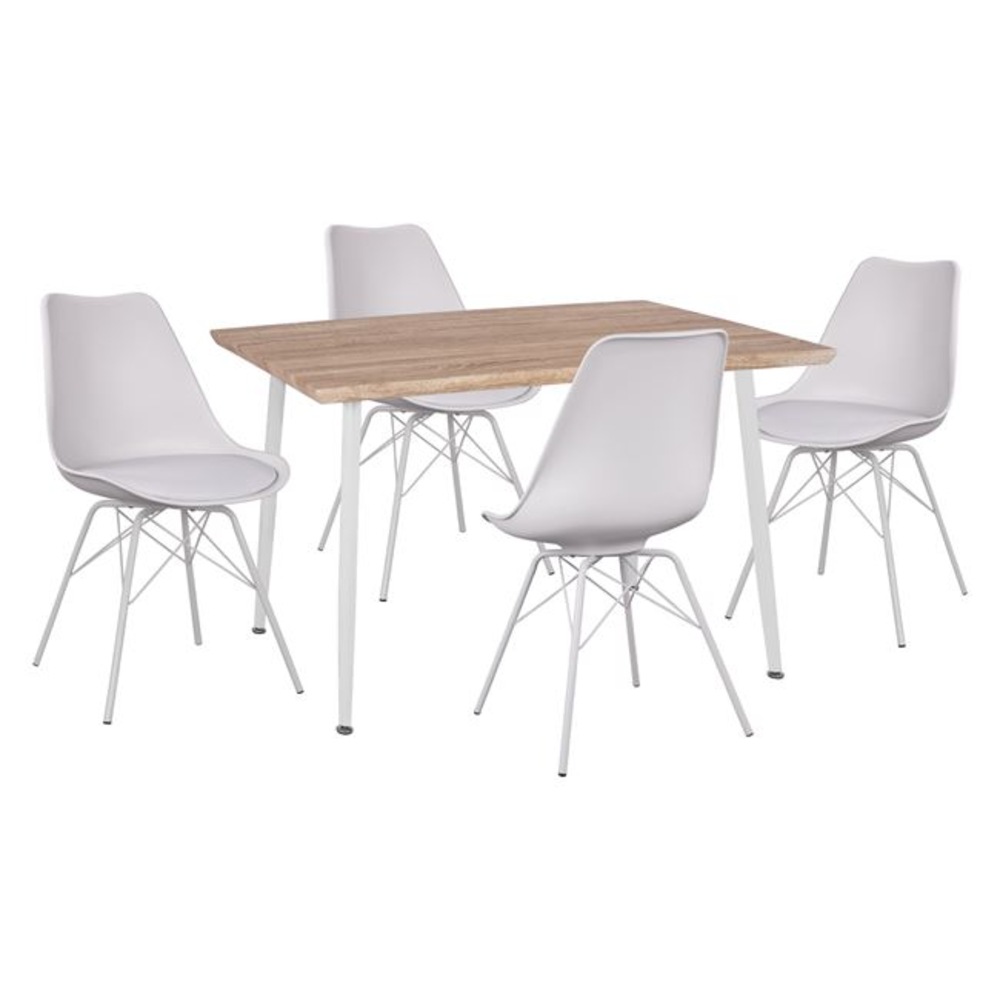Τέσσερις καρέκλες τραπεζαρίας με υψηλής ποιότητας κάθισμα από πολυπροπυλένιο με δερμάτινο PU μαξιλαράκι σε λευκό χρώμα και μεταλλικό σκελετό και πόδια σε λευκό χρώμα.